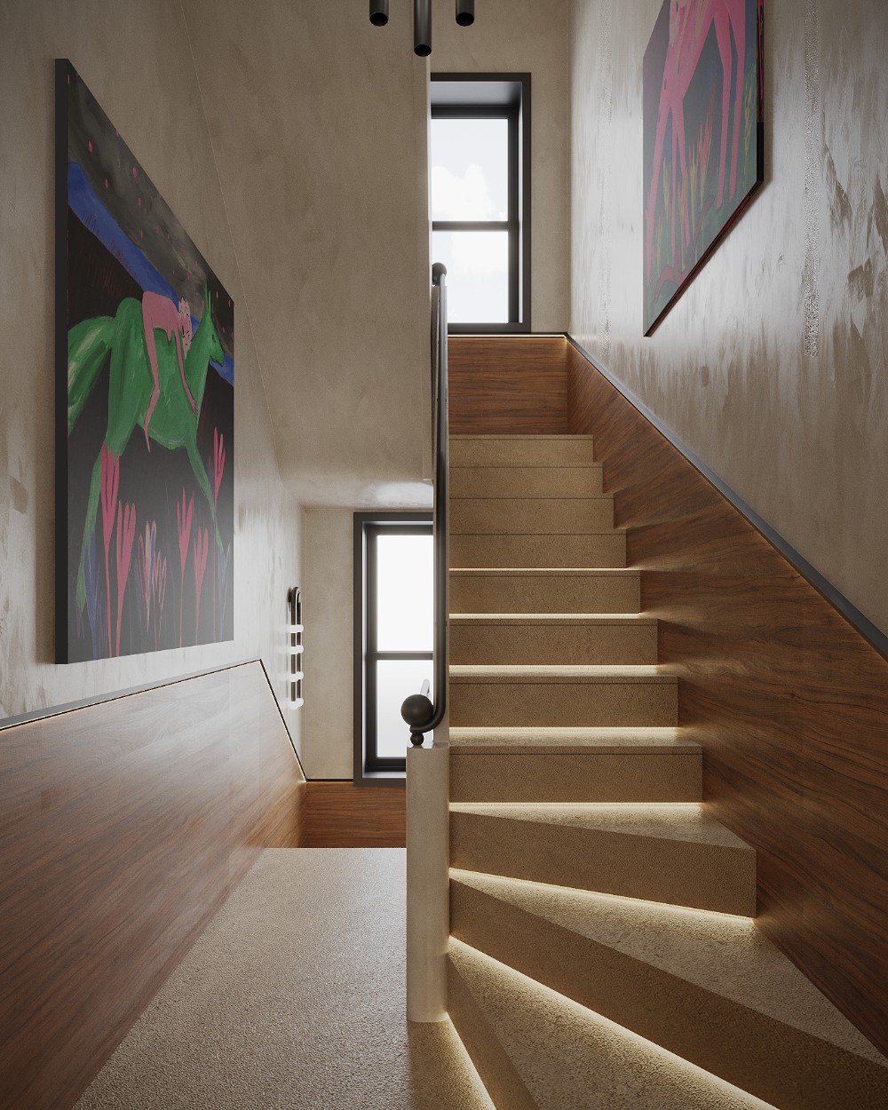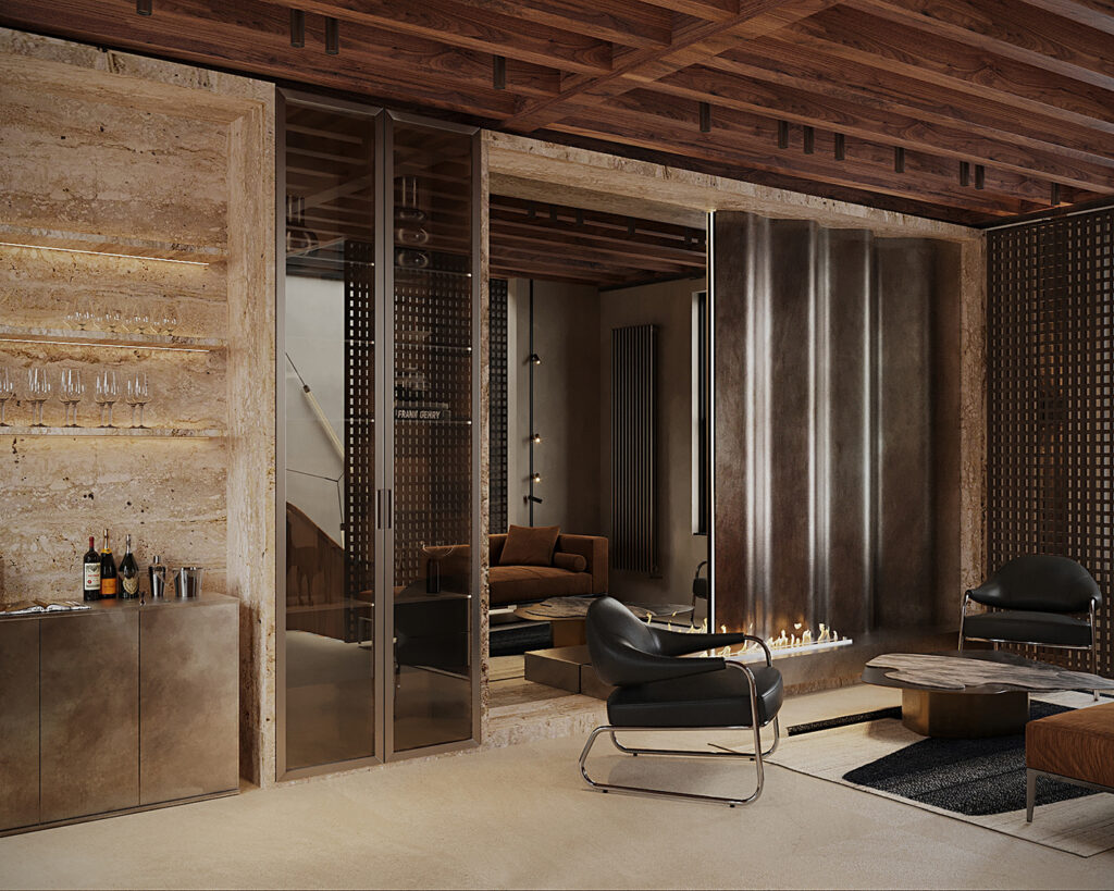 The Copperleaf Home, our point of focus today, is a project by Taras Kaminskiy, Aleksandra Shokarova, and Alina Zherepa. Expect modern design, but warmer, softer, and more inviting. Here, wood, stone, and light do all the talking. These create a space that feels bold yet comforting. Every corner has a story, from the glowing staircase to the textured walls and statement furniture. It’s a home that proves modern can still feel human.