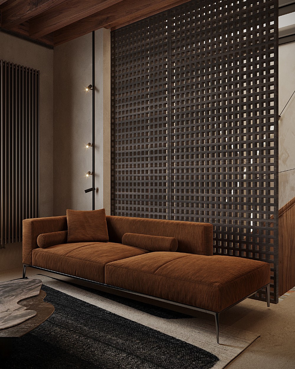 The seating arrangement keeps things comfortable but never boring. A plush sofa with earthy-toned pillows is paired with sculptural chairs, giving the room both elegance and personality. The rug ties it all together with its free-flowing lines, almost like a hand-drawn sketch grounding the space. And then, of course, the shelving: a geometric showpiece with its mix of textures and finishes.