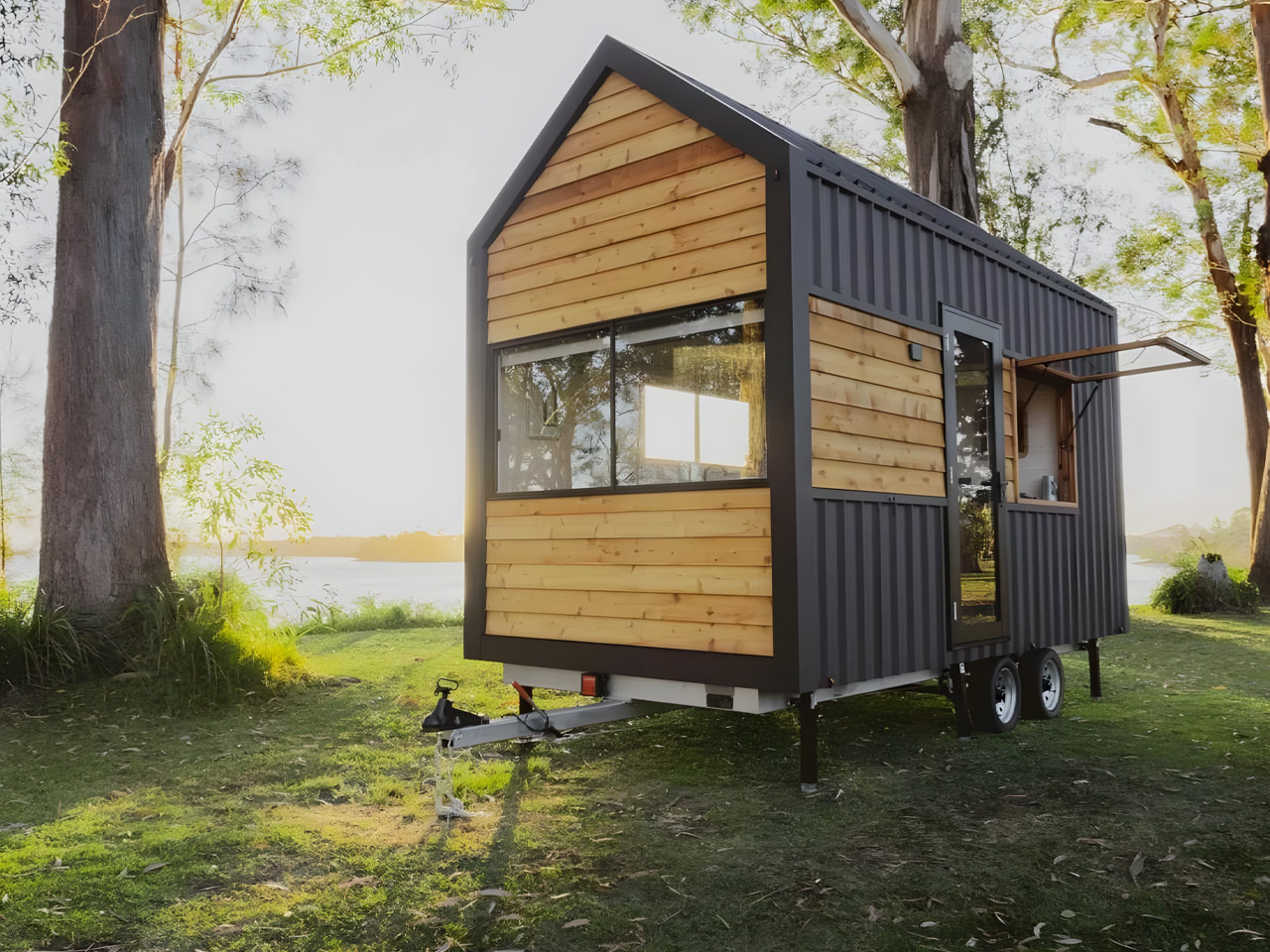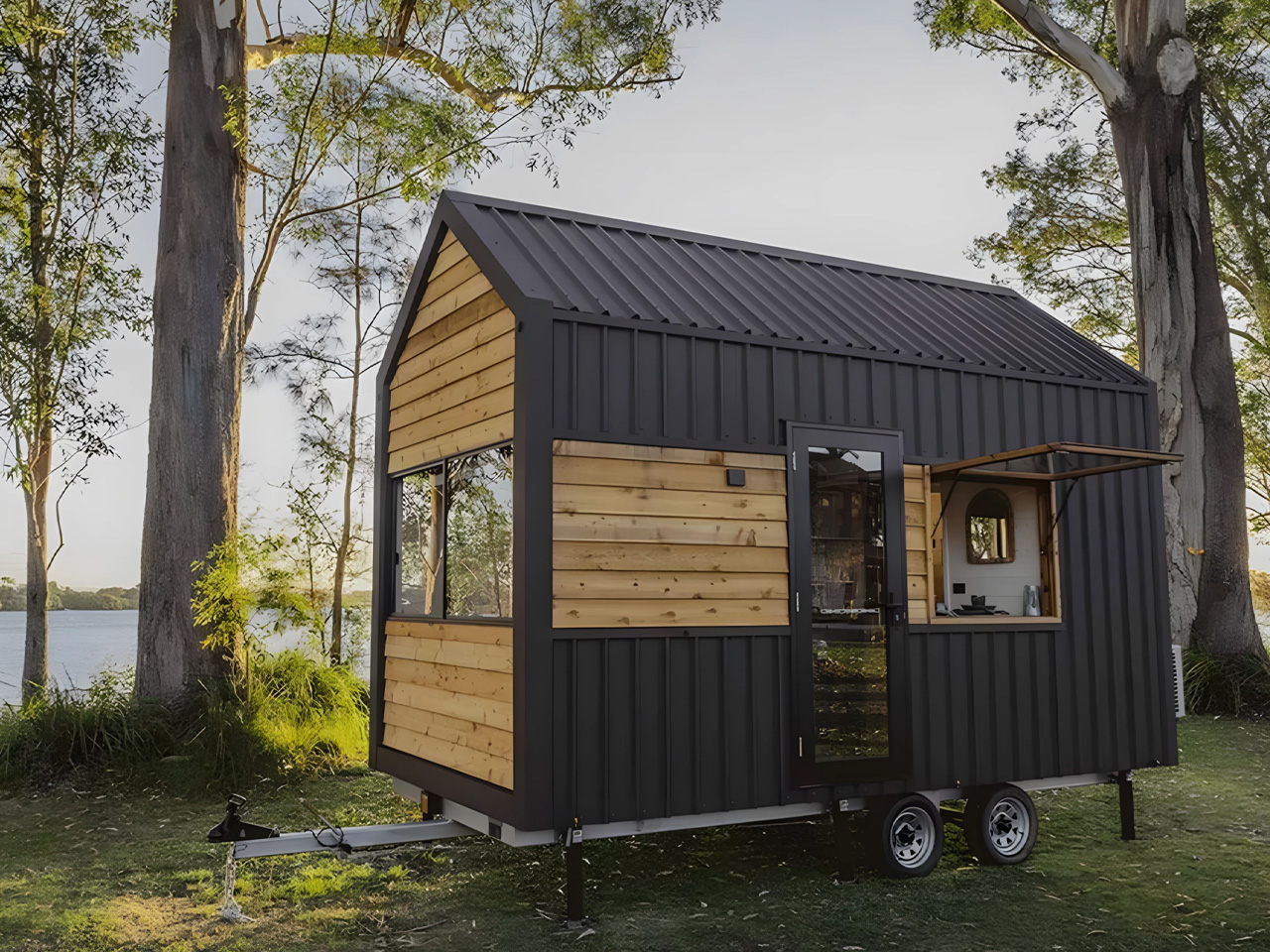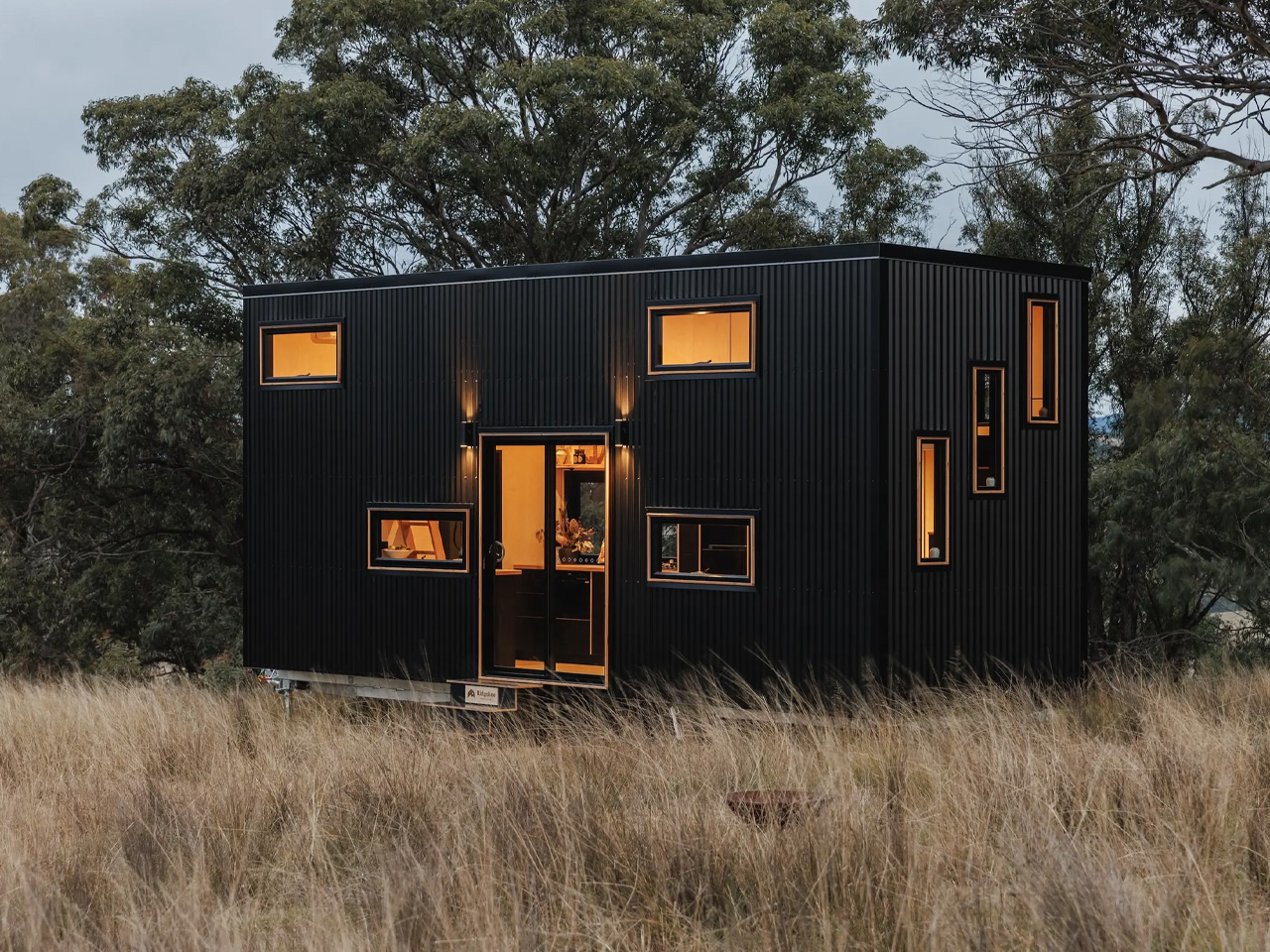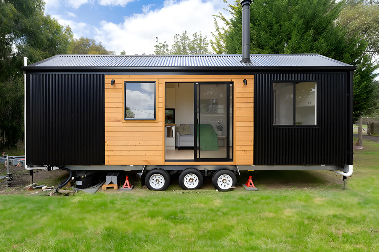 Evergreen Homes Australia designed the Casuarina specifically for people who’ve hesitated to embrace tiny living due to mobility concerns or ladder-climbing reluctance. This 8.4-meter home sits entirely on one level, creating a comfortable and cozy space for two people plus occasional guests. The black metal exterior receives timber accenting that softens the industrial edge, while the triple-axle trailer base provides stability during transport and stationary periods.