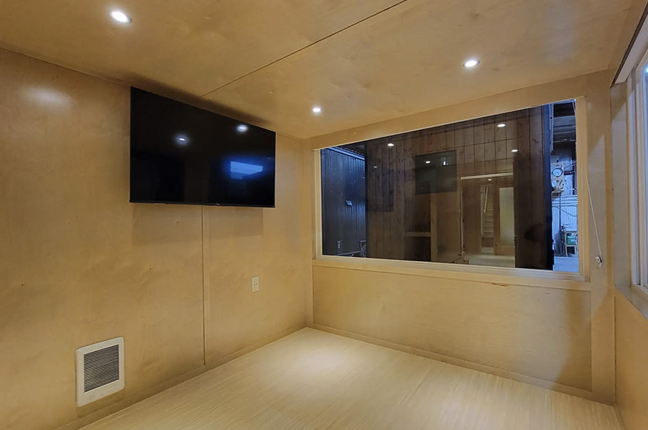 Large windows define the eONE XL experience, allowing natural light to stream freely throughout the day and creating an interior that feels warm and inviting. The ‘e’ in its name signifies all-electric appliances, reflecting modern efficiency standards and eliminating propane dependence. As you enter, a spacious and well-designed kitchen welcomes you with pantry storage, fridge/freezer, microwave, induction cooktop, electric oven, sink, generous cabinetry, and a washer/dryer. This level of kitchen functionality rivals conventional homes, while the additional storage and floor space throughout the home address common tiny living complaints about insufficient room for belongings.
