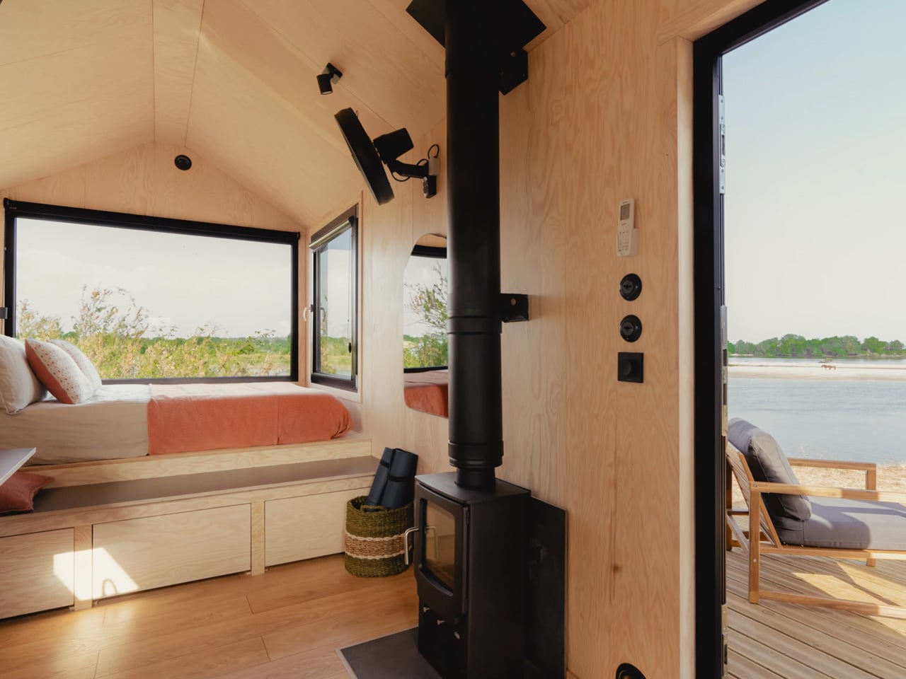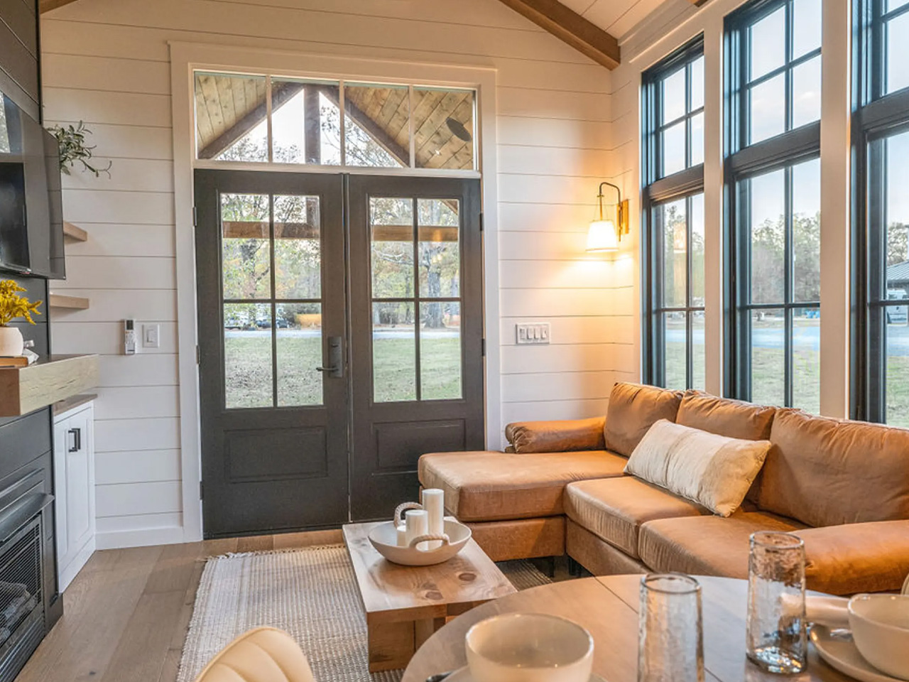 The living room punches above its weight with floor-to-ceiling windows bringing serious natural light that makes the space feel twice its actual size. A sleeper sofa serves double duty as comfortable seating and a guest bed when friends visit, while smart built-ins keep clutter controlled. The loft bedroom shows why Backcountry understands tiny living, with a lowered platform providing actual headroom for getting dressed. Under-bed storage swallows seasonal clothes and extra bedding without creating visual chaos, while two people sleep comfortably with enough room for nightstands and personal touches, making it feel like home rather than a hotel room.