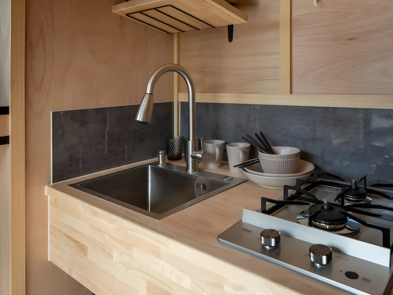 The comprehensive approach to self-sufficiency includes solar panels, a gas water heater, a gas cooktop, a refrigerator, a composting toilet, and optional water tanks, creating a genuinely independent system. Occupants can disconnect from municipal services while maintaining modern conveniences, making this ideal for remote locations or environmentally conscious owners seeking to minimize utility dependence. Though this model can be permanently installed on a plot, its trailer-based construction allows relocation whenever desired. The pictured rental includes an optional deck that effectively extends the living area outdoors, creating a seamless transition between interior and exterior spaces.